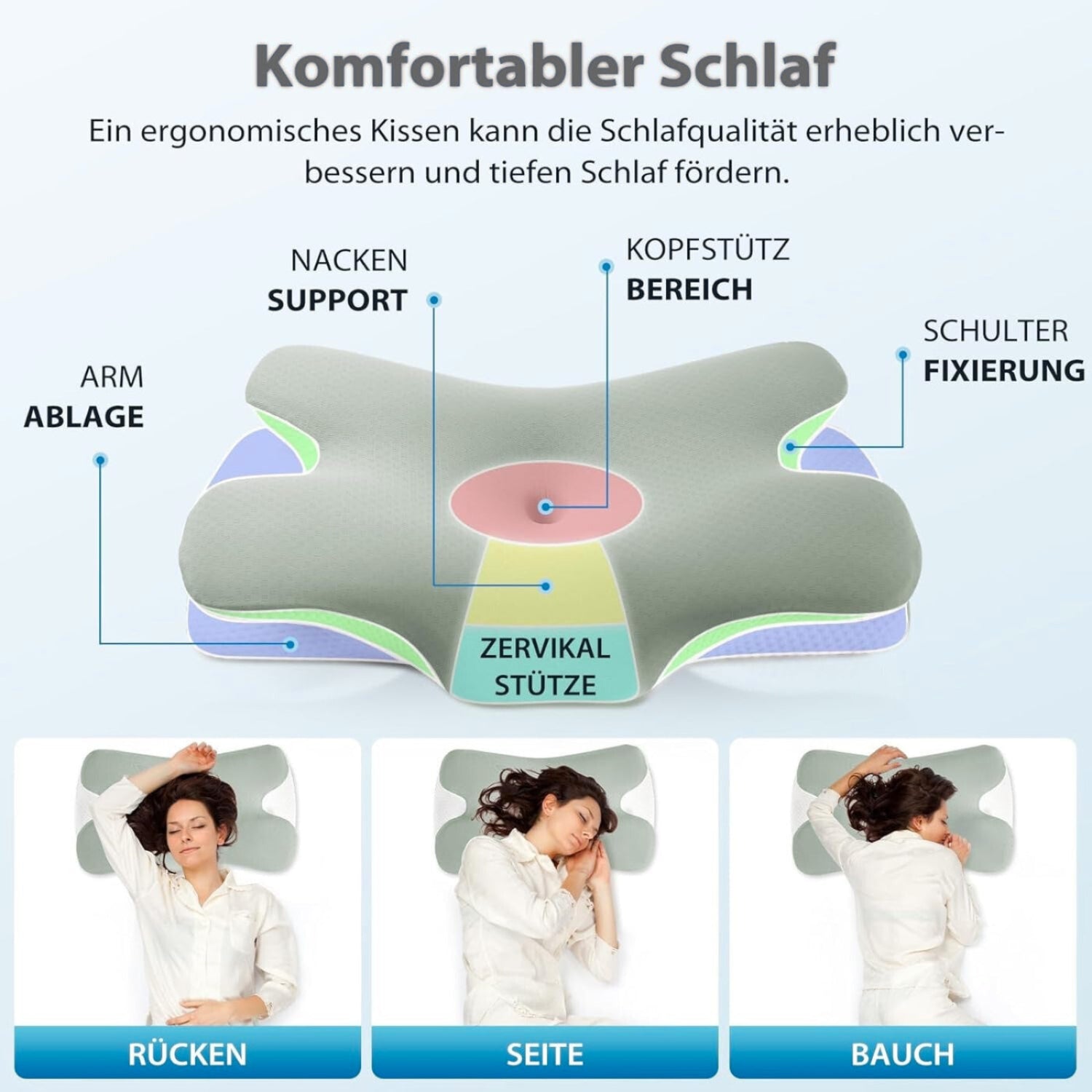 Die seitlichen Aussparungen, die zentrale Kopfmulde und das stützende Nackenprofil sorgen in jeder Lage für Stabilität und Komfort – ganz ohne Herumdrehen oder Kissenwenden.